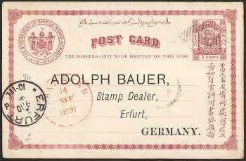 Philatelic postcard, sent from Sandakan (the seat of the state before World War II) on 14 September 1891 and passing Singapore on 19 September before arriving to Erfurt on 9 October 1891.