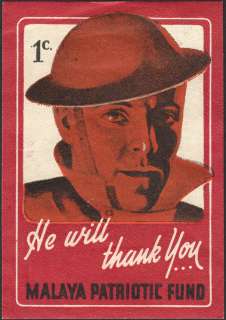 At first the stamps will be available only in the main post offices, but a second issue of 50,000 is now being printed, and very soon these stamps will be available at all the smaller post offices. For letters posted to addresses overseas this stamp will provide a very striking reminder that in this remote country of the Empire a vigorous drive for war charities is in progress, while on letters circulating within Malaya the stamps will provide excellent publicity for the Patriotic Fund, as well as raise money for it.