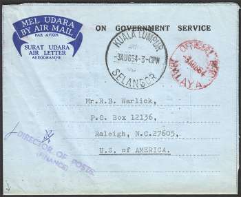 Malaysia - Official Aerogramme, Used in 1964 to the USA