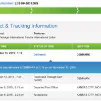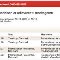 | 12-11-2015 19:23 | Internationalt Postcenter, Danmark | Forsendelsen er ankommet til modtagerlandet |