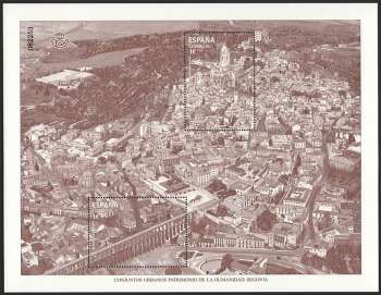 In 1985, the old city of Segovia and its Roman Aqueduct were added to UNESCO's list of Urban World Heritage Sites. This commemorative issue, printed using chalcography and consisting of a block sheet with two stamps, features an aerial view of the city. The stamps show the Santa María Cathedral and the famous Aqueduct.