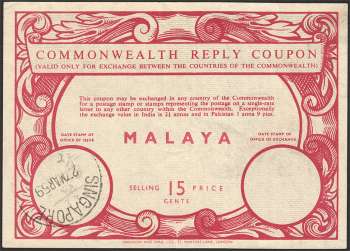 Malaya - 15 cents : Commonwealth Reply Coupon (1959) Model Barbados Type IX
