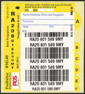 Malaysia PosDaftar Track-On 7 (Yellow : Domestic Registration with AR Delivery Card) Aug 2015
