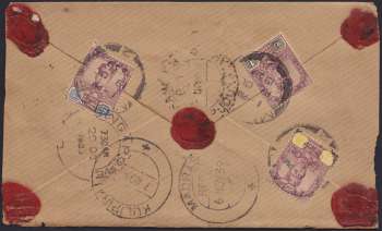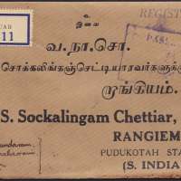 A registered postal cover sent from Muar, Johore to Rangiem, Pudukotah State, India.