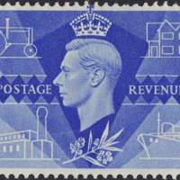 The dominating feature of the three penny stamp is the face of King George VI surmounted by a crown. Significantly, if the stamp is properly oriented, as a map with north to the top, the King is in the east.