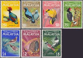 During 1965 Malaysia issued its first definitive stamps. The stamps featured orchids for the State low values and birds for the Malaysia high values. Each State had its own set, identical with the exception of the State name and Rulers portrait or State crest as applicable. The eight high values were printed in portrait format, featuring Malaysian birds, and had 'MALAYSIA' printed on them in place of State names.