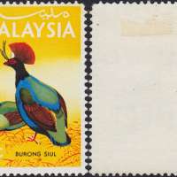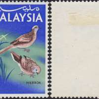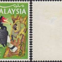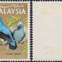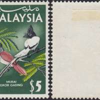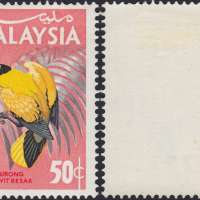 Eight values were issued for the medium and high values featuring Malaysian birds. The values were 25 cents, 30 cents, 50 cents, 75 cents, $1, $2, $5 and $10 and were intended for use in any Malaysian State. As with the low values, they were printed in two panes of 100, 10 x 10 with cylinder numbers 1A and 1B for the left and right pane, watermarked 'Multiple PTM upright' perforated 14 1/2. Various proofs exist showing the individual colours and combined up to full colour proofs. In addition, each value was produced on Harrison proof cards in full colour. As with the low values, missing colours can be found on a few values and inverted watermarks on the 25 cents, 30 cents, 50 cents, $1, $2 and $5 values.