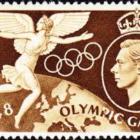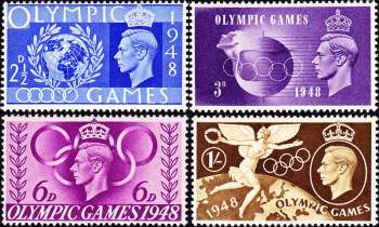 When London was given the honor to host the Olympics again in 1948, Games of the XIV Olympiad, Great Britain took on the challenge to design symbolic stamps to mark the occasion.