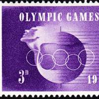 Postage stamp (6d) featuring “Olympic Symbol,” designed by Stanley D. Scott.