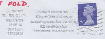 The postmark is worded; "Well done to Royal Mail Group employees for raising £2 million for Prostate Cancer UK"