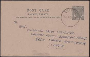 Pahang - 6¢ Postcard from Kuantan to Selangor (1956)