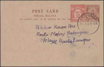 MALAYA 4¢ ڤيراق POST CARD PERAK, MALAYA THE ADDRESS ONLY TO BE WRITTEN ON THIS SIDE