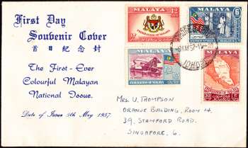 First Day Souvenir Cover 首日紀念封 The First-Ever Colourful Malayan National Issue Date of Issue 5th May 1957.
