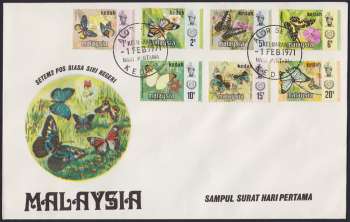 On 1 February 1971 new sets of low value stamps were issued for use in the individual States, replacing the previous Birds and Orchids stamp issue. The new stamps featured Malaysian butterflies on all values and were printed by Bradbury Wilkinson.