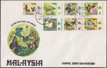 On 1 February 1971 new sets of low value stamps were issued for use in the individual States, replacing the previous Birds and Orchids stamp issue. The new stamps featured Malaysian butterflies on all values and were printed by Bradbury Wilkinson.