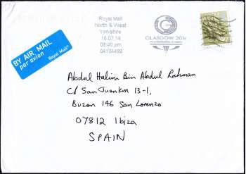 Spain - Postal Cover from Great Britain (2014) Glasgow 2014