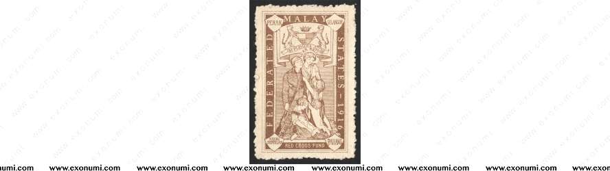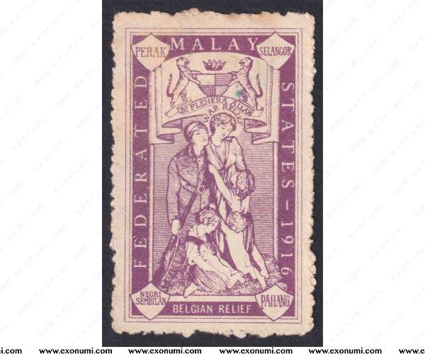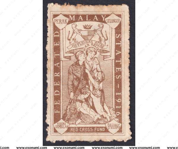 Arms of the Federated Malay States on banner over war orphans and widows.