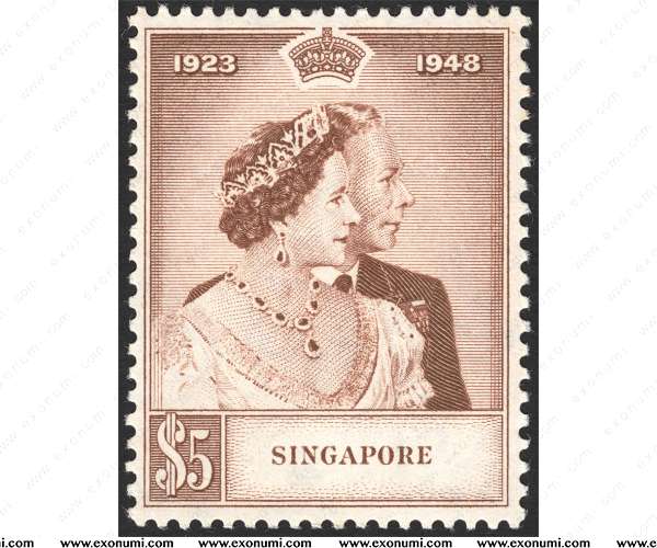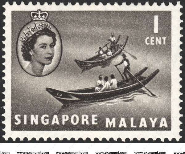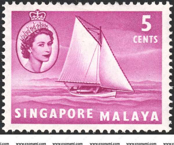 Queen Elizabeth's coronation issue produced the last common design stamp which Singapore issued together with other British Colonies. It also meant a new definitve set was needed. In fact, a new defintive set was being prepared with the King's head but the untimely passing of King George VI made it necessary to feature the next monarch - Queen Elizabeth II who graced the stamp, finally issued in 1955. This was a beautiful set featuring principally seacrafts in view of Singapore's importance as a major sea-port and trading centre. As if the designer foresaw Singapore becoming a major aviation hub twenty years later, the 25¢ value depicted an "Argonaut" aircraft. The orginal design was that of a "Comet" aircraft but the series of aircrashes involving that name of aircraft necessitated a change in design. The lower values were printed by photogravure and the three top values by the recess method. Many printing plates were used for the lower values but only two for the recess printed stamps. There were several printings which could be distinguished by the paper, shades and the intensity of the background.