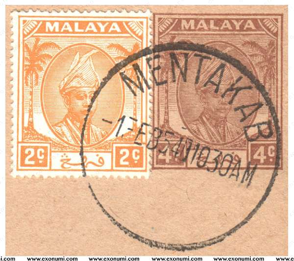Sultanate of Pahang : Postcard 4¢ + Uprated 2¢ (Stamp) Used in 1954