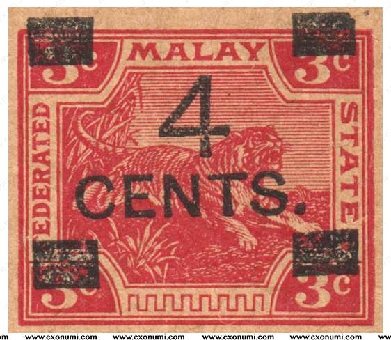 Federated Malay States - Postcard (1918) '4 CENTS.' Overprinted on 3¢ in Black & Original Values Cancelled by Four Rectangles