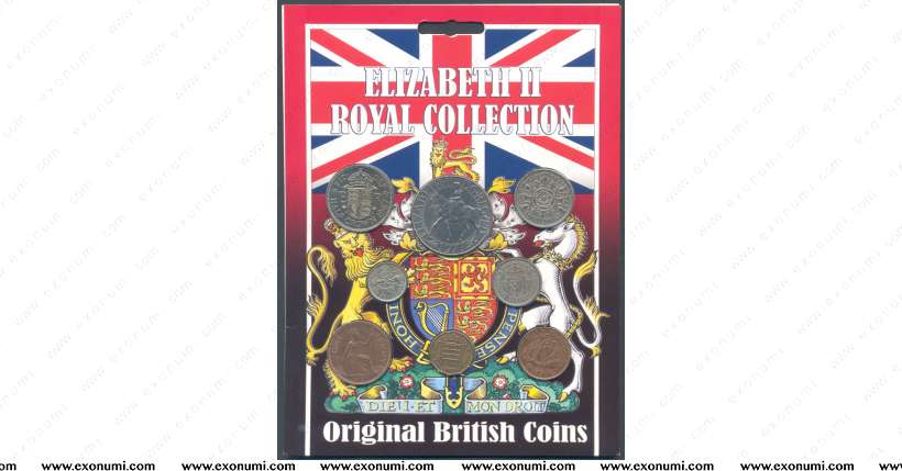 This Elizabeth II Royal Collection coin pack contains 8 coins, all held in a clear blister on a card.