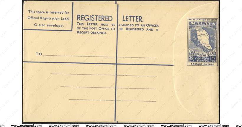 REGISTRATION 20 CENTS MALAYA FEDERATION OF MALAYA 30 CENTS ڤرسكوتوان تانه ملايو ٣٠ سين POSTAGE 10 CENTS