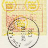 The Frama distributor used a unique gummed paper, with a neutral yellow background with the postal emblem and the continuous text JABATAN PERKHIDMATAN POS MALAYSIA.